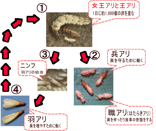 飛来した羽アリ(羽蟻・ハアリ)は羽を落とし、条件が満たされると家屋 の中や庭先に巣を作ります。 |